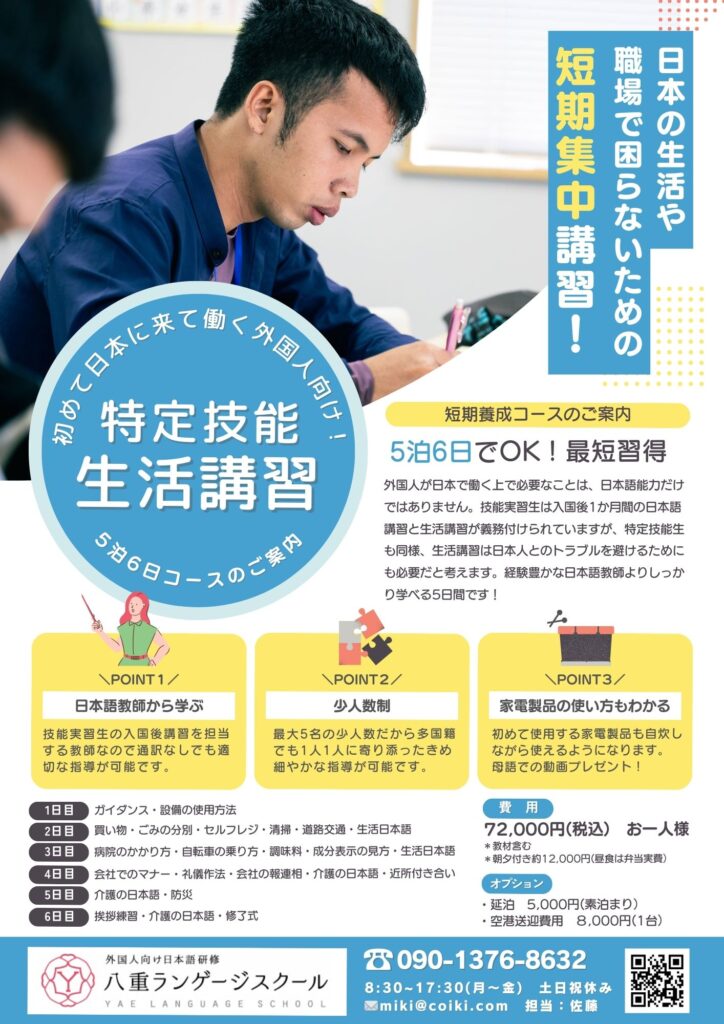 外国人が日本で働く上で必要なことは、日本語能力だけではありません。技能実習生は入国後1か月間の日本語講習と生活講習が義務付けられていますが、特定技能生も同様、生活講習は日本人とのトラブルを避けるためにも必要だと考えます。経験豊かな日本語教師よりしっかり学べる5日間です!
