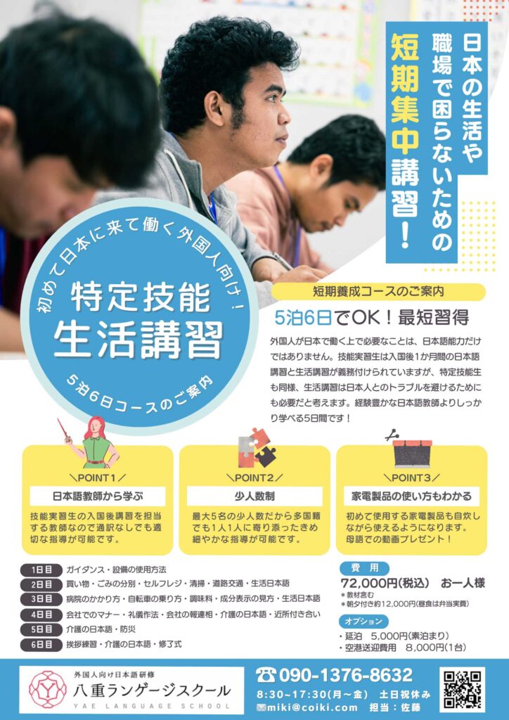 外国人が日本で働く上で必要なことは、日本語能力だけではありません。技能実習生は入国後1か月間の日本語講習と生活講習が義務付けられていますが、特定技能生も同様、生活講習は日本人とのトラブルを避けるためにも必要だと考えます。経験豊かな日本語教師よりしっかり学べる5日間です!